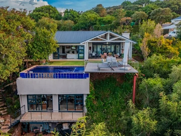 The property is well-secured with an electric fence, electric gate, security lighting, and security boom access to the complex. It offers 3 garages, 1 carport, and reliable utilities including 15,000L water tanks with an industrial filtration system, a 5KVA solar system, and a 10KVA backup generator.