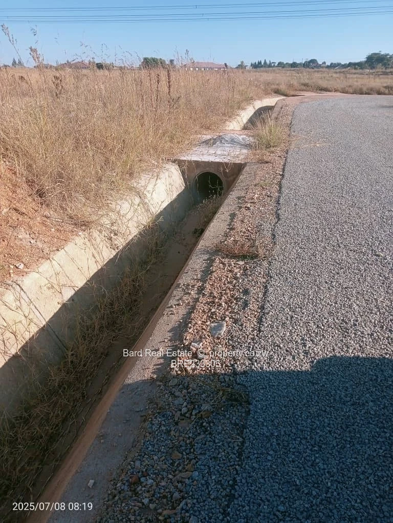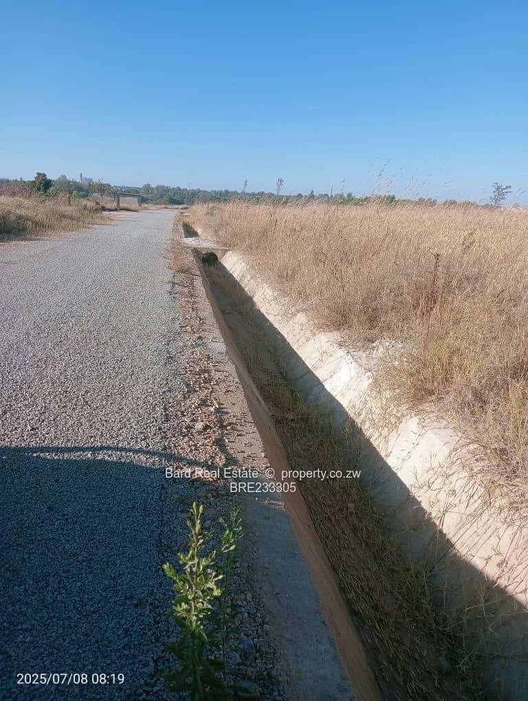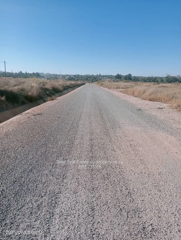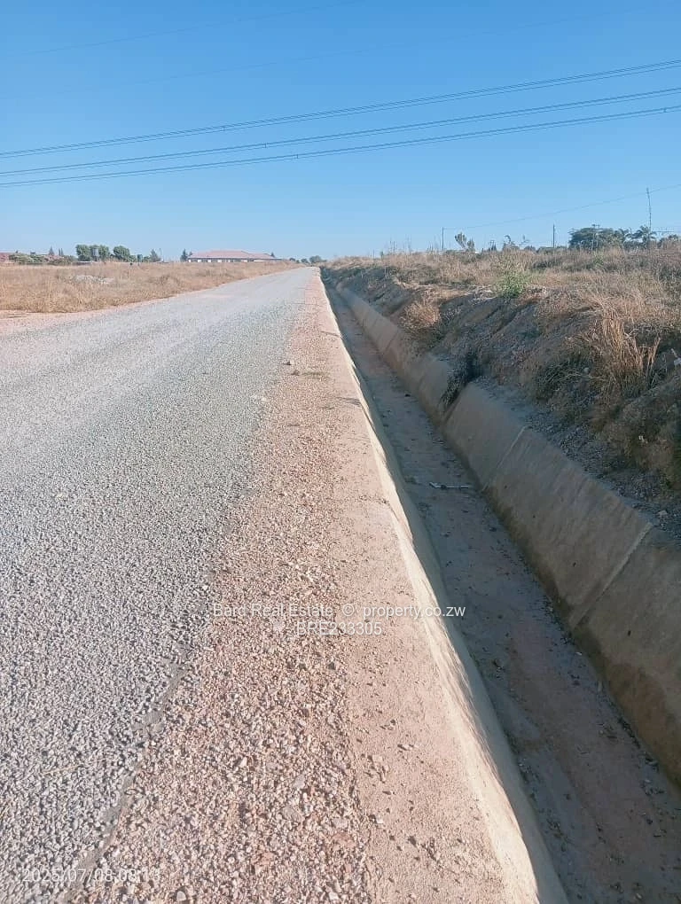 Prime 2,000 m² residential stands for sale in Sunway City, Harare East — perfectly positioned with main road frontage and excellent development potential. The plots sit on a level, easy-to-build site flanking a well-constructed tarred road with concrete stormwater channels in place and visible overhead power lines, indicating established electrical infrastructure. The stands offer sweeping open views, clear sightlines from the main road, and straightforward access for construction vehicles. Ideal for a spacious family home, duplex development or long-term investment in a growing suburb. Ready for immediate development with mains services and solid road frontage. Contact us today to arrange a site visit and secure this strategic Sunway City parcel.